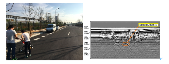 图3.用200MHz探地雷达管线测试——工业园区门口下水道管深度3.8米